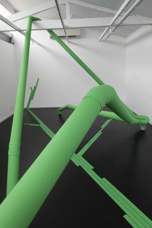 ’The invisible circulatory systems of buildings and institutions – their air-conditioning vents, electrical cabling, their hot and cold water, and sewerage pipes – are invoked by the large PVC pipe sculptures of Sydney artist, Biljana Jancic. Since 2013, Jancic has made these sculptures in response to the specific dimensions and features of different architectural and institutional spaces. ...With each iteration of these sculptures, Jancic coats the piping in different bold, graphic colours; past works have been painted black, magenta, electric-blue and metallic gold; in so doing, she invokes the formal concerns of many twentieth-century modernists who explored the possibilities of drawing with colour, expanded here into a spatial practice. For TarraWarra Biennial 2016, Jancic has created a new pipe sculpture titled Conduit in response to the gallery and office architecture of TarraWarra Museum of Art.’
